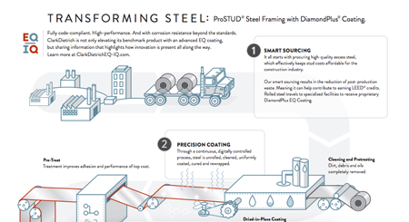 Earlier this year we launched our “EQ-IQ” initiative, a campaign to raise awareness on innovations in cold-formed steel framing, especially as it relates to the benefits of equivalent or “EQ” coatings. These specialized coatings are the byproduct of advanced science and provide several performance benefits over traditional G40 galvanized steel, like better jobsite durability and extended corrosion protection. However, there seems to be some confusion in the industry surrounding EQ coatings. We feel that with a little education on recent advancements such as EQ coatings and product transparency, we can continue to position cold-formed steel as the preferred building material of choice for commercial and mid-rise construction. With this in mind, we recently created an infographic that takes you through every step in the manufacturing process of our EQ-coated steel framing system, ProSTUD® with DiamondPlus® coating.