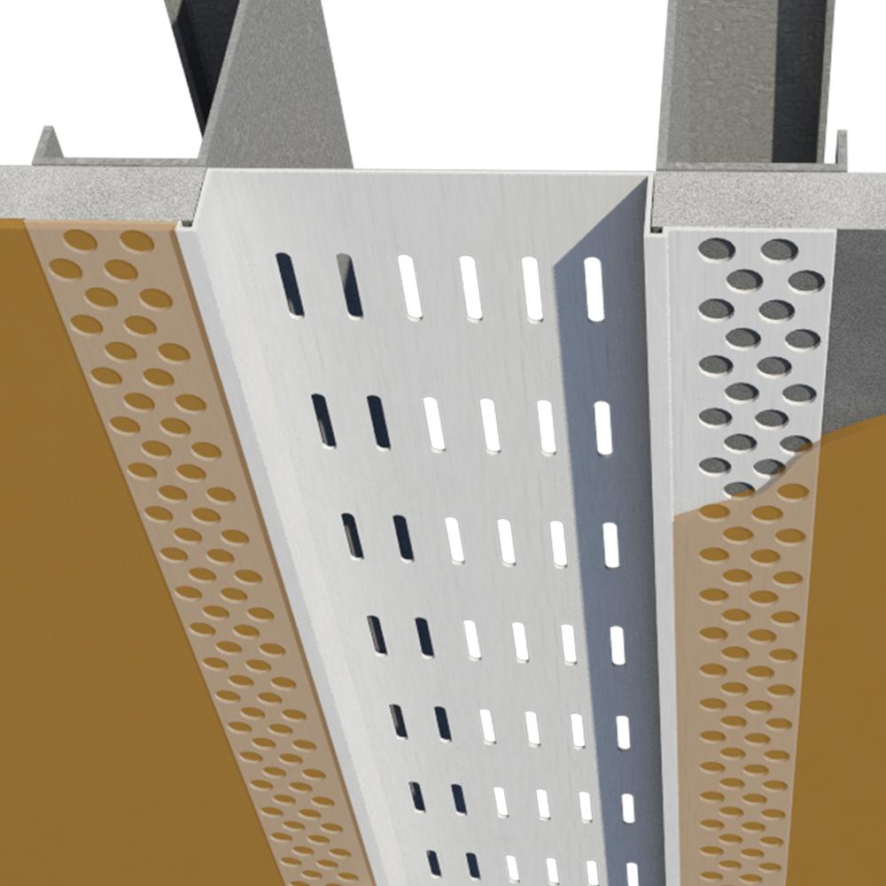 A variation on the vented channel reveal for when the design style calls for a different aesthetic. The slots function in the same way as the holes, allowing air to flow around the perimeter to assist with temperature control and moisture management. Always use a rigid backing or blocking material behind surface-mounted reveal. Has 3/4" elongated vent holes. Perforated flanges allow the base coat mixture to easily flow through and bond with the substrate. Vent clips are provided with vented channel reveals to connect reveal sections and assist in alignment.