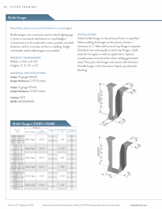 Attach bridle hanger to the primary frame as specified. When welding the hanger to the primary frame, a minimum of 1/8" x 2" fillet weld on each top flange is required. Distribute the weld equally on both top flanges. Uplift loads do not apply to weld on applications. Place joist into hanger and secure with fasteners. If bridle hanger is less than beam depth, provide back blocking.