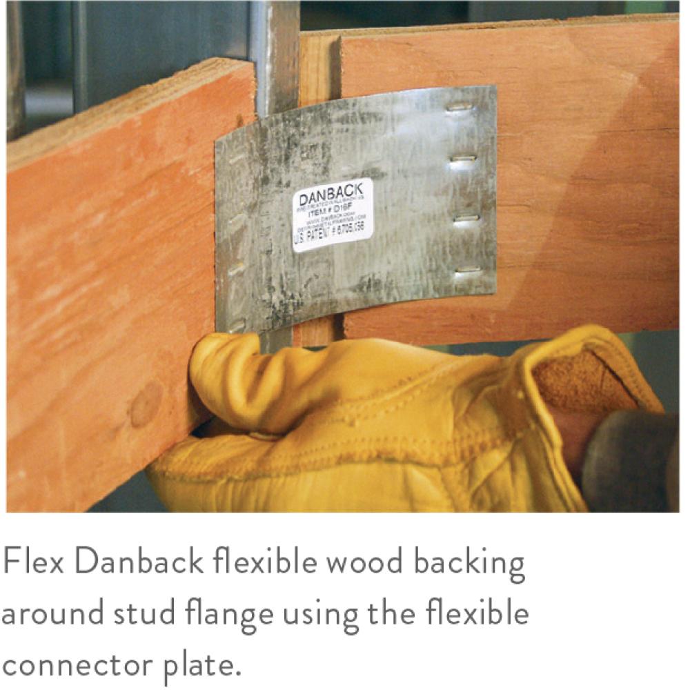 • Flex Danback flexible wood backing around stud flange using the flexible connector plate.