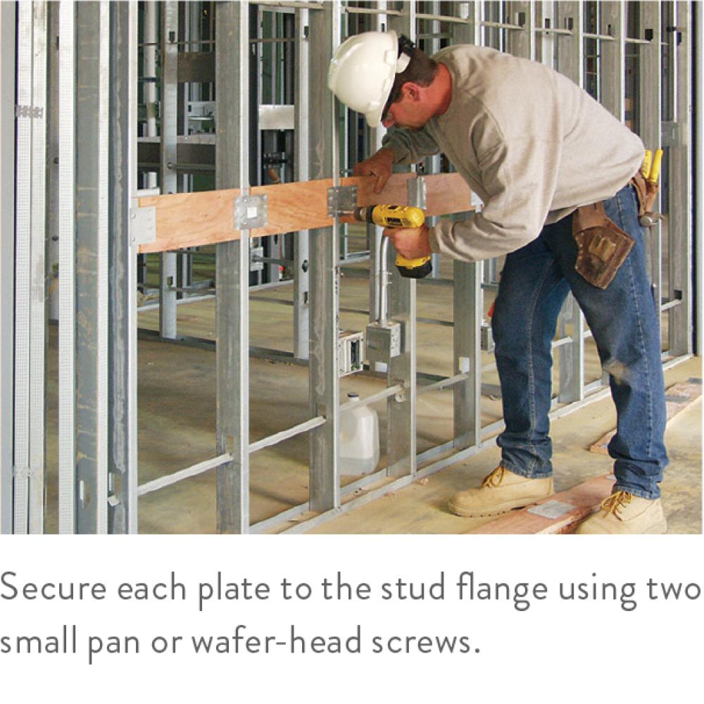 • Secure each plate to the stud flange using (3) #8 wafer head/pan head screws. Place one screw at the center and one screw 1/2" from top and bottom of the plate edge.