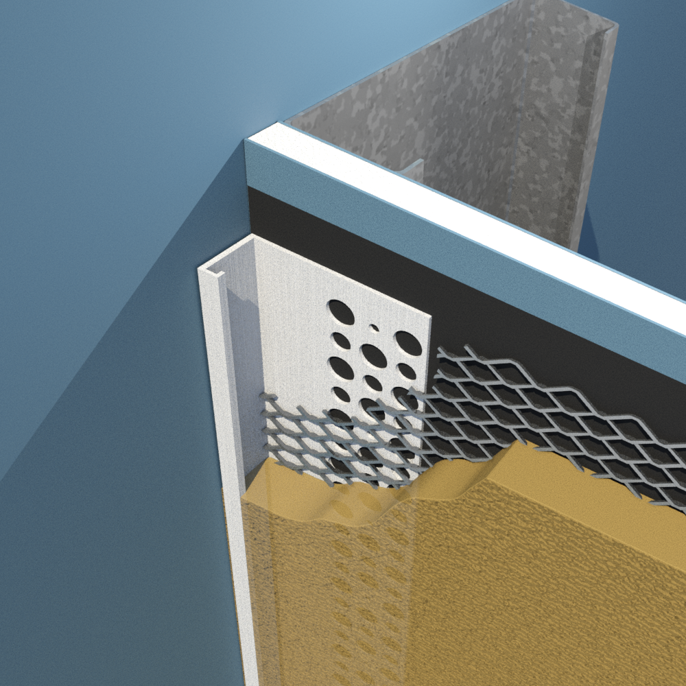 Terminates stucco and plaster against windows, doors and other dissimilar materials.