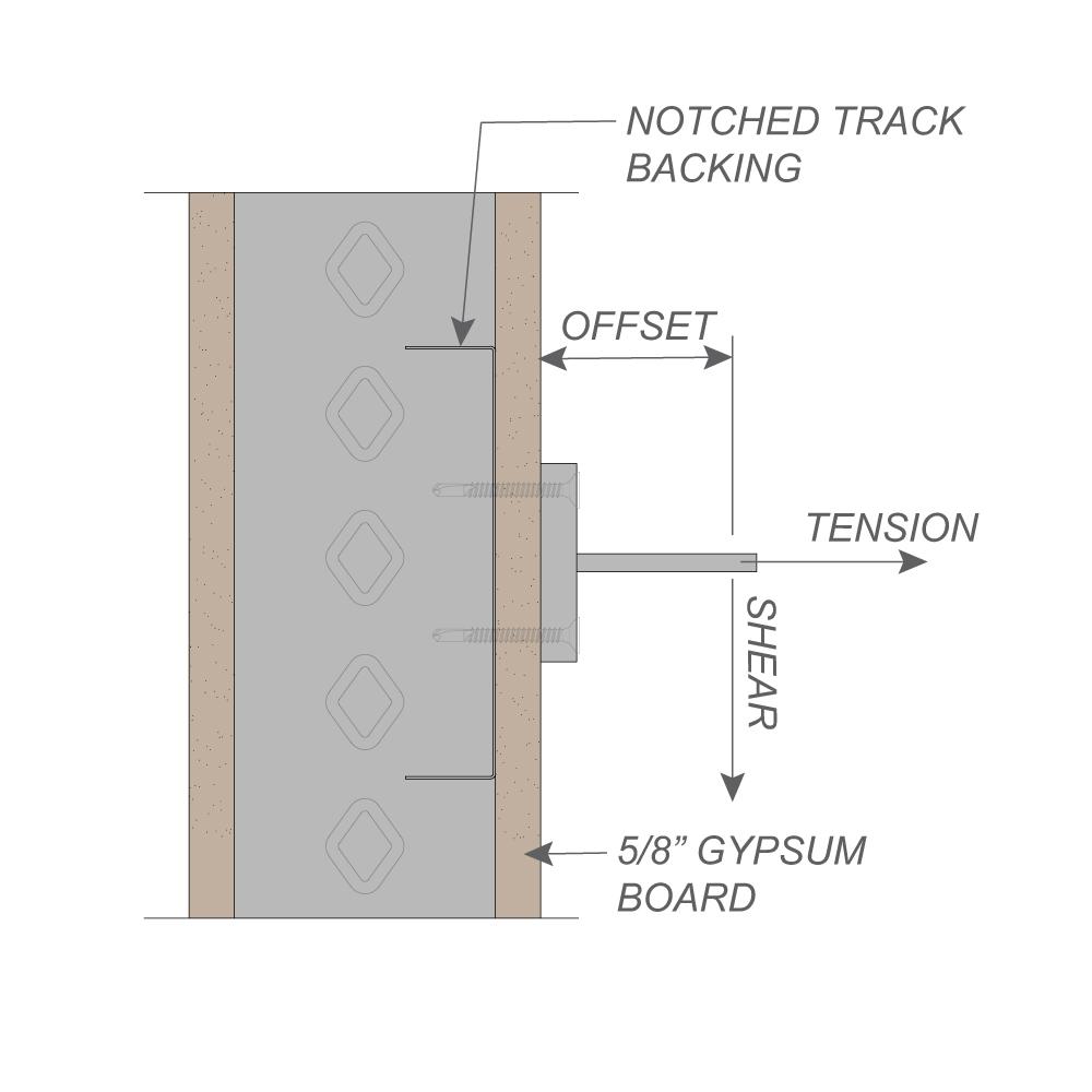 The Notched Track in anchored to the metal studs with (3) #8 wafer head/pan head screws. One screw at the center and one screw at 1" from the top and bottom edges.