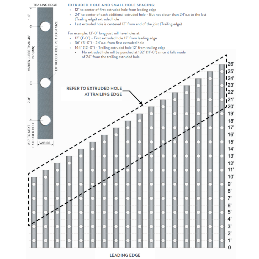 Extruded hole layout for joists spanning 12'-0" through 26'-0" at 1-0" increments. Alternate/specific span capacities available to accommodate typical building layouts and floor/roof loads Alternate span lengths available. Contact ClarkDietrich Technical Sales or Engineering for assistance.