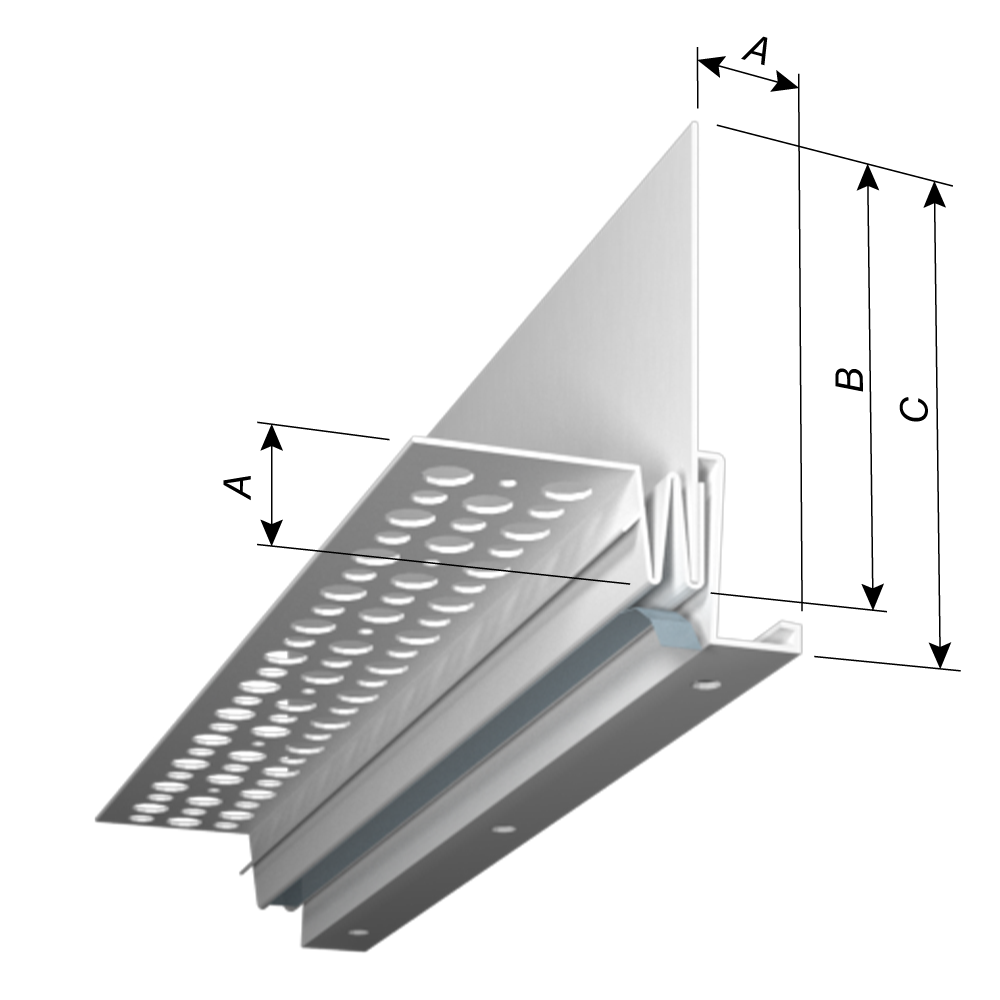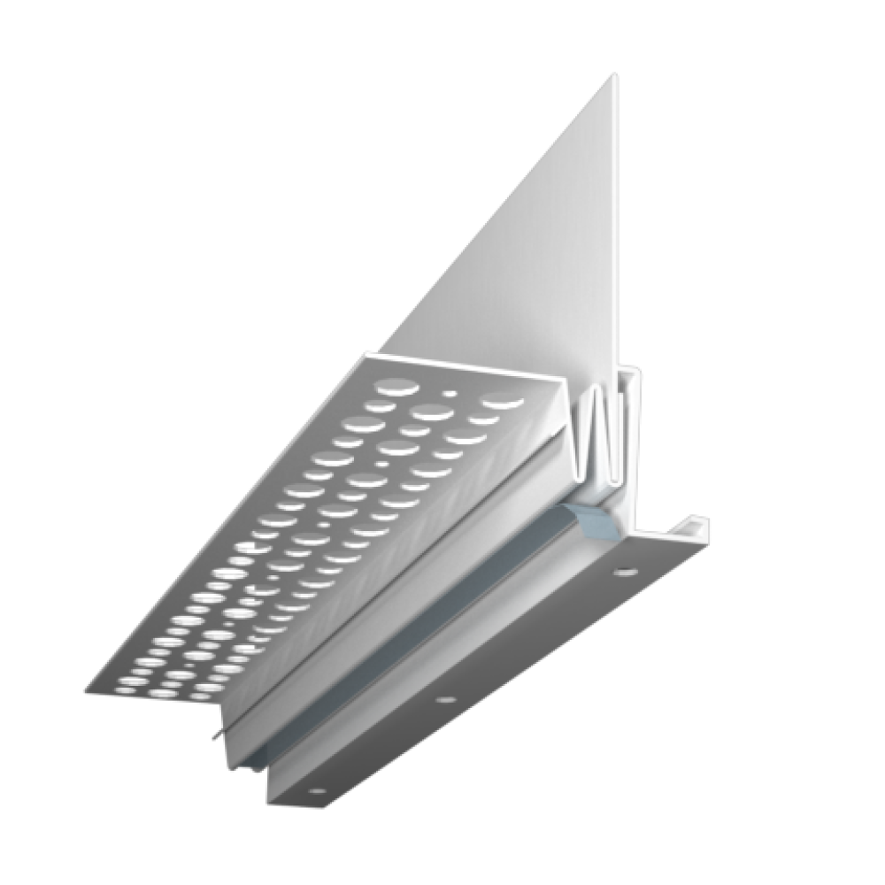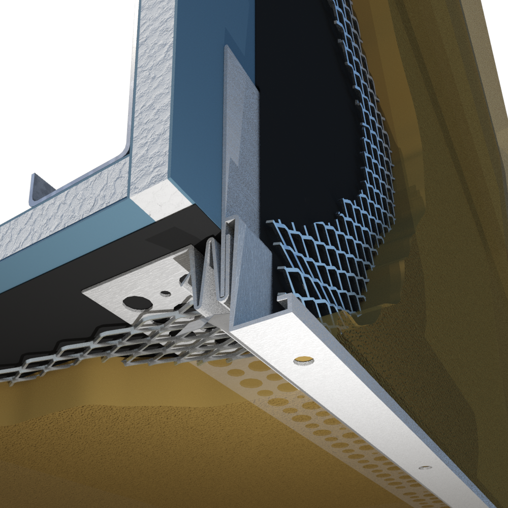 The DS15-78-25WX Drip Screed is placed at the bottom of framed wall construction at the stucco plane transition. Weather resistant barriers on the vertical plane are placed over the top of the drip screed to ship-lap.  Weather resistant barriers on the horizontal plane are placed under the horizontal flange of the Drip Screed.  With weep holes in the casing bead component, the accessory encourages proper moisture drainage away from the stucco installation. Along with weep holes, the casing bead component provides a ¼” drip leg to ensure that moisture escapes the vertical component and does not travel to the horizontal plane. The control joint component features a taped V-groove joint to keep material out of the joint during installation and to provide a clean finish with minimal effort by simply removing the tape after the stucco has been applied. Additionally, this control joint component allows for movement of the trim during temperature fluctuations and helps to prevent cracking as the installation shifts with the changes in the building. The vertical flange is a non-perforated vinyl casing and weather barriers are placed over it to act as a flashing and as a stucco stop with weep.  The drip screed component is ideal for soffit transitions, balconies, or any protrusion of size outside the vertical wall and serves to maintain the plaster look.  The 3-1/2" solid attachment flange installed in this procedure complies to Chapter 25 if IBC, Chapter 7 of IRC and ASTM C-1063 (stucco) and ASTM C1780 for Thin Veneer Stone.